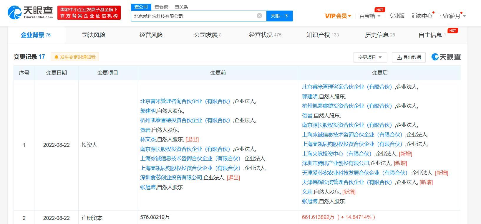 鞭牛士 9月9日消息,天眼查App显示,近日,智能农作物种植公司北京爱科农科技有限公司发生工商变更,股东新增深圳市腾讯产业创投有限公司、天津爱芯农农业科技发展合伙企业(有限合伙)等,注册资本由约576.08万增至约661.61万,增幅约14.85%。